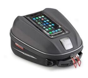 In the old days when nearly all gas tanks were steel, we were inseparable from our magnetic tank bag, which was big enough to carry the stuff we needed, instantly mountable/dismountable, and therefore easily swapped from motorcycle to motorcycle. Now that many bikes have plastic or aluminum or plastic-covered tanks, it’s not so easy, but there are even more specialized options now, including the Givi ST611+ Tanklock 6L Tank Bag pictured, which has a specific mount to latch onto the gas cap surround of many bikes. (We rounded up a bunch of great tank bags last September.)